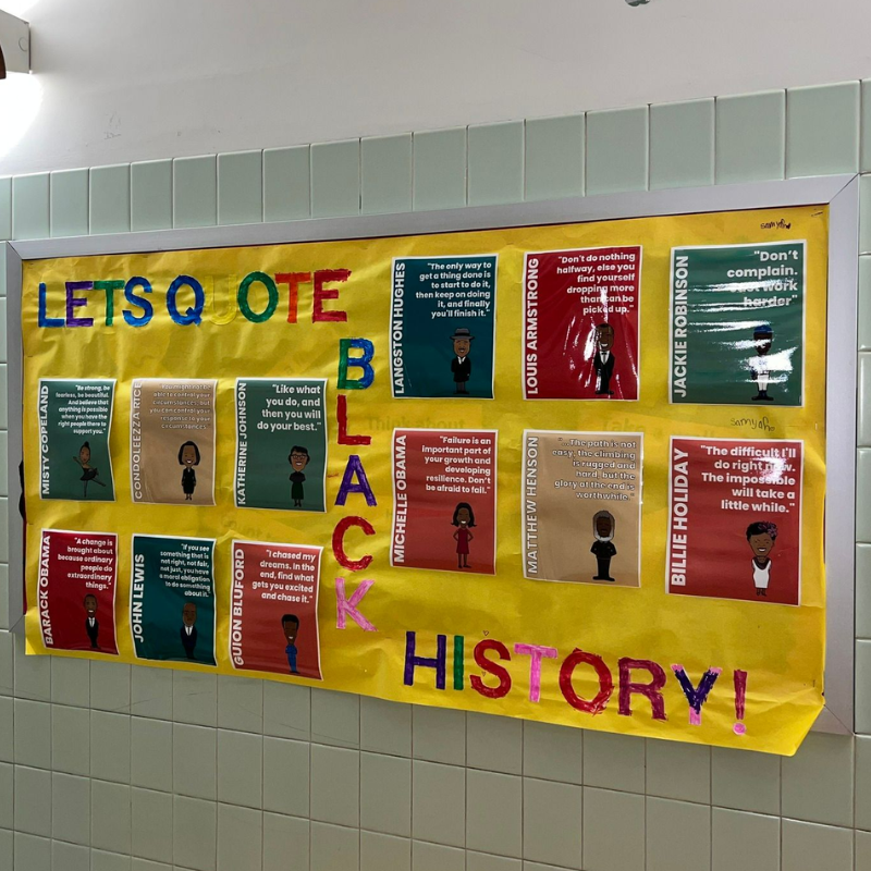 Susquehanna Township Middle School students assisted their site coordinator in decorating the cafeteria bulletin board with quotes from prominent Black figures in today's society and history for Black History Month.