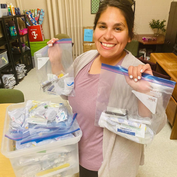 Thanks to the Missions, Service & Public Life and New Student Programs departments at Baylor University, freshmen assembled 50 hygiene bags for CIS of the Heart of Texas as a part of their Welcome Week service day. Program director, Toni Holt, was all smiles as she delivered the bags to students.