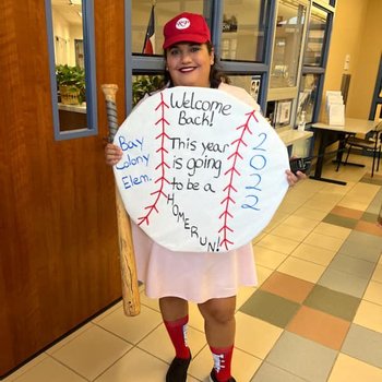 Equipped with motivational signs, site coordinator Mrs. Von Dran stood in the car rider line and the campus lobby dressed as a Rockford Peach from the movie A League of Their Own to welcome CIS of the Bay Area students back to school.